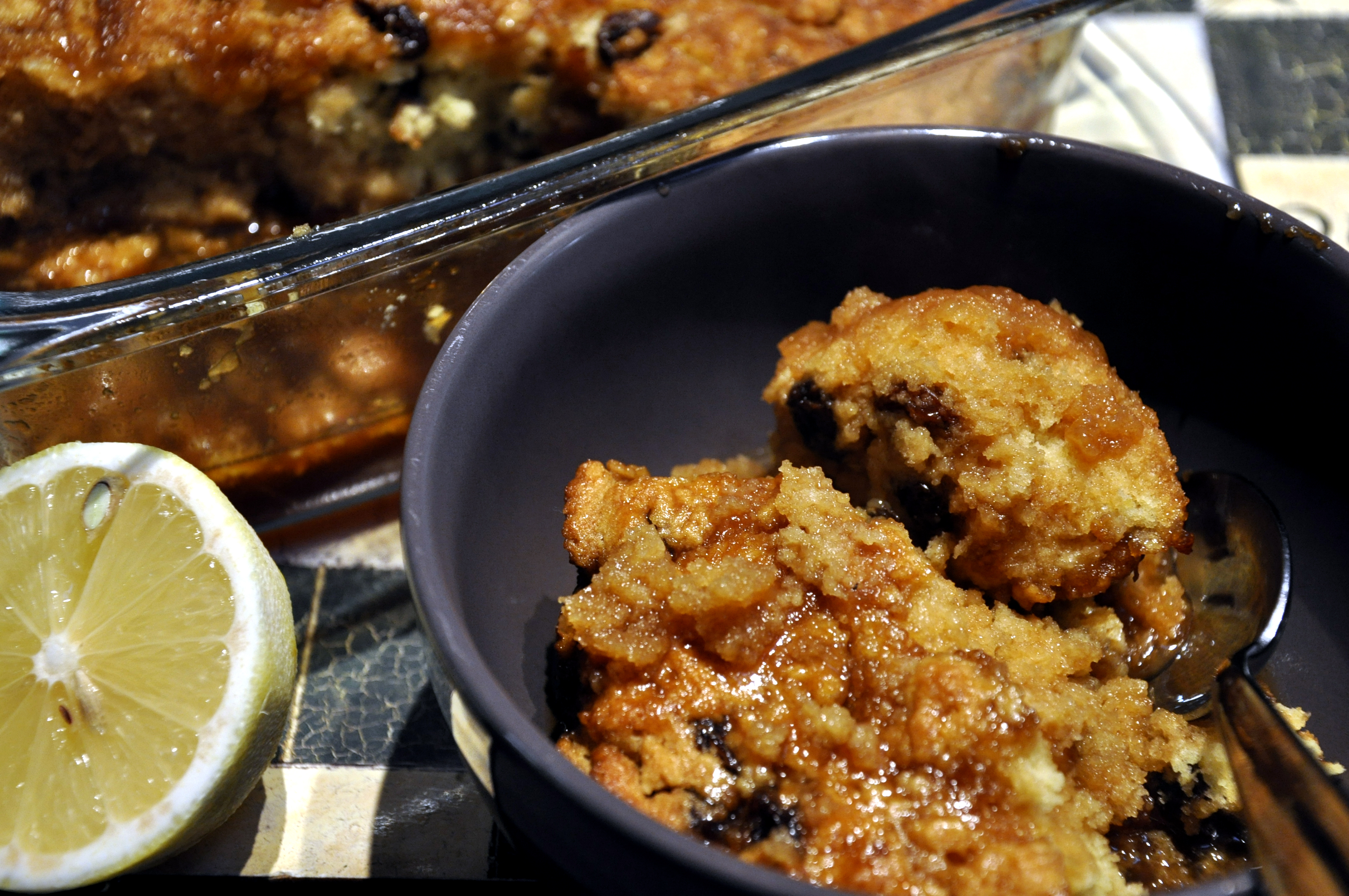 Cream the butter, lemon zest and sugar. Beat in the egg. Stir in the sultanas, then stir in the milk and flour bit by bit until well mixed. Spoon into the ovenproof dish and smooth the surface. Combine the sauce ingredients in a small saucepan. Bring to the boil, then gently pour oven the pudding batter. Bake for 35 – 40 minutes for a large pud, or approx 20 minutes for individual poddings. When done the pudding will be floating on the sauce and be firm to touch.