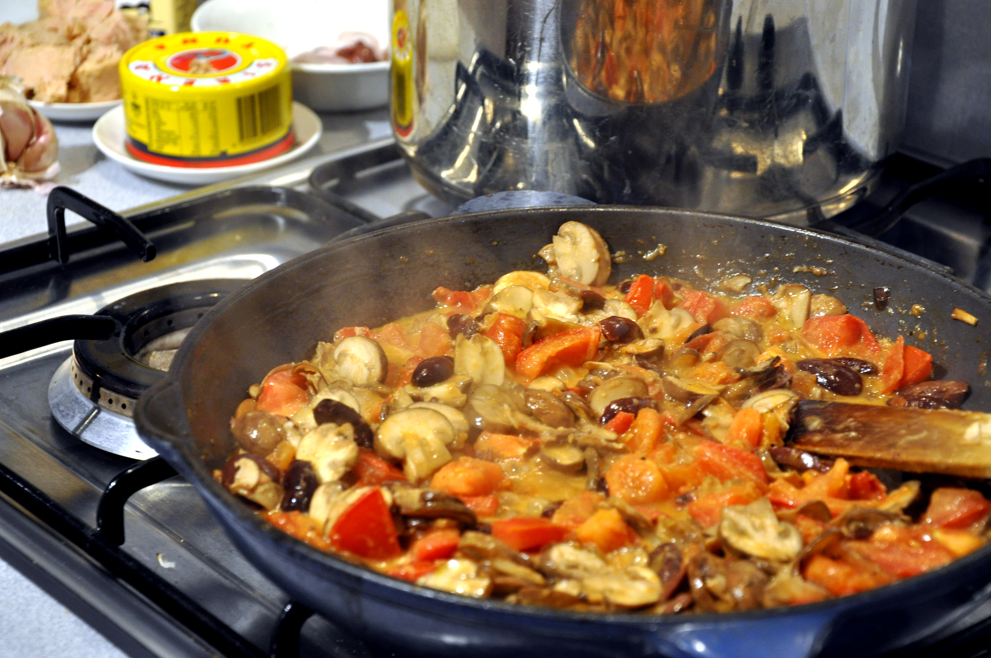 Drain the tuna and reserve the oil. Heat the oil from the tuna can plus 2 tablespoons of olive oil, sauté the mushrooms and garlic until well coloured. Add the cream, cook for a couple of minutes, then add the tomatoes and olives and simmer for 5 minutes. Break up the tuna with the back of a fork then add to the sauce. Cook for a further 2 minutes, then stir in the parsley. Top with freshly grated parmesan cheese at the table.