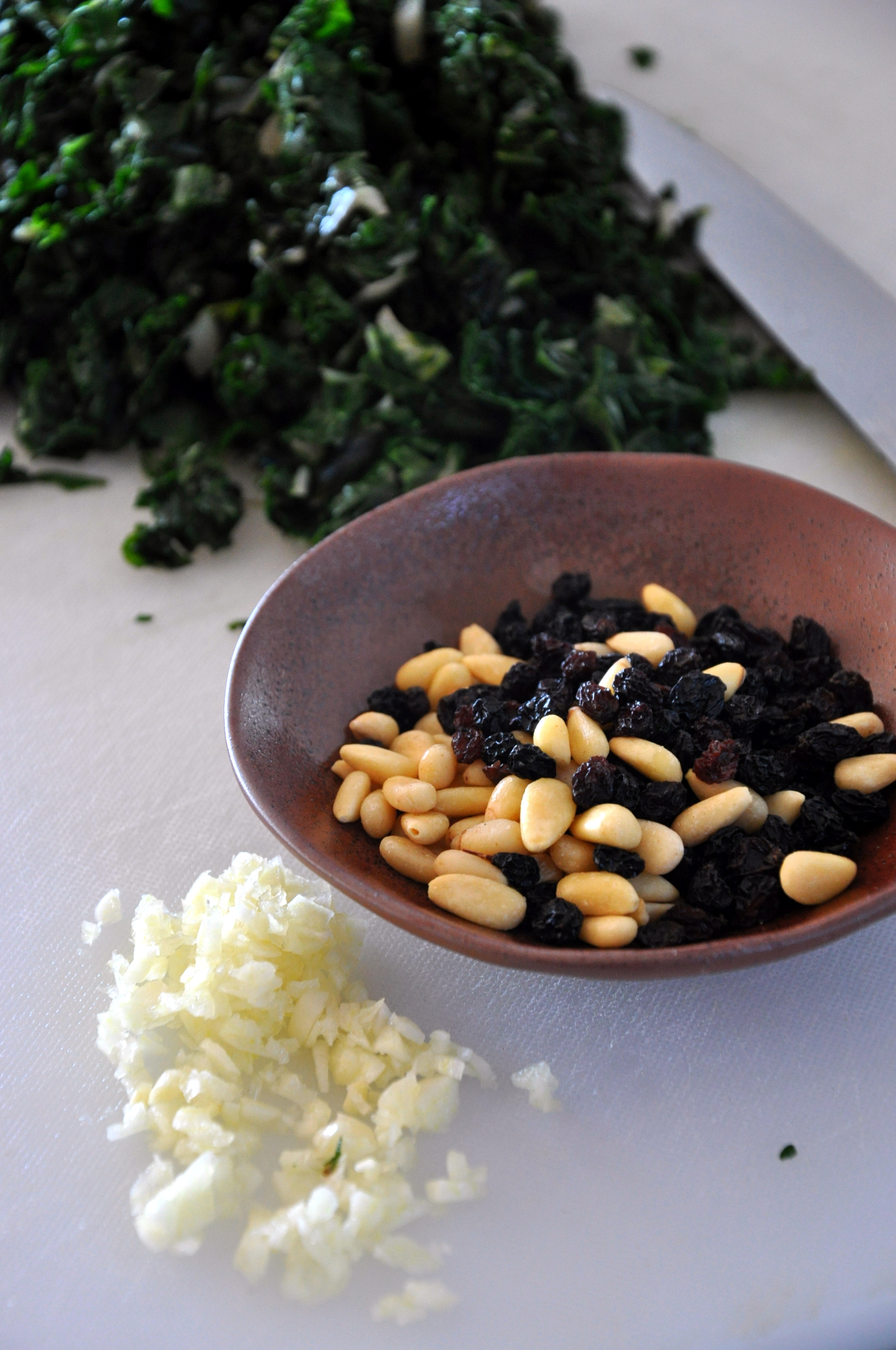 Strip the leaves from the chard stems. Discard the stems, wash the leaves thoroughly, then drain. Steam the leaves over a low heat, just in the water that remains clinging to them. When they have collapsed to a soft mass remove from the heat and refresh in iced water. Drain, squeeze as much water as possible from the leaves, finely chop. Heat the olive oil and sauté the garlic, add the chard leaves and cook to evaporate any remaining water. Add the cumin, currants and pine nuts a cook for a couple of minutes longer, until the nuts are toasted. Remove from the heat and season with salt and pepper to taste. Cool.