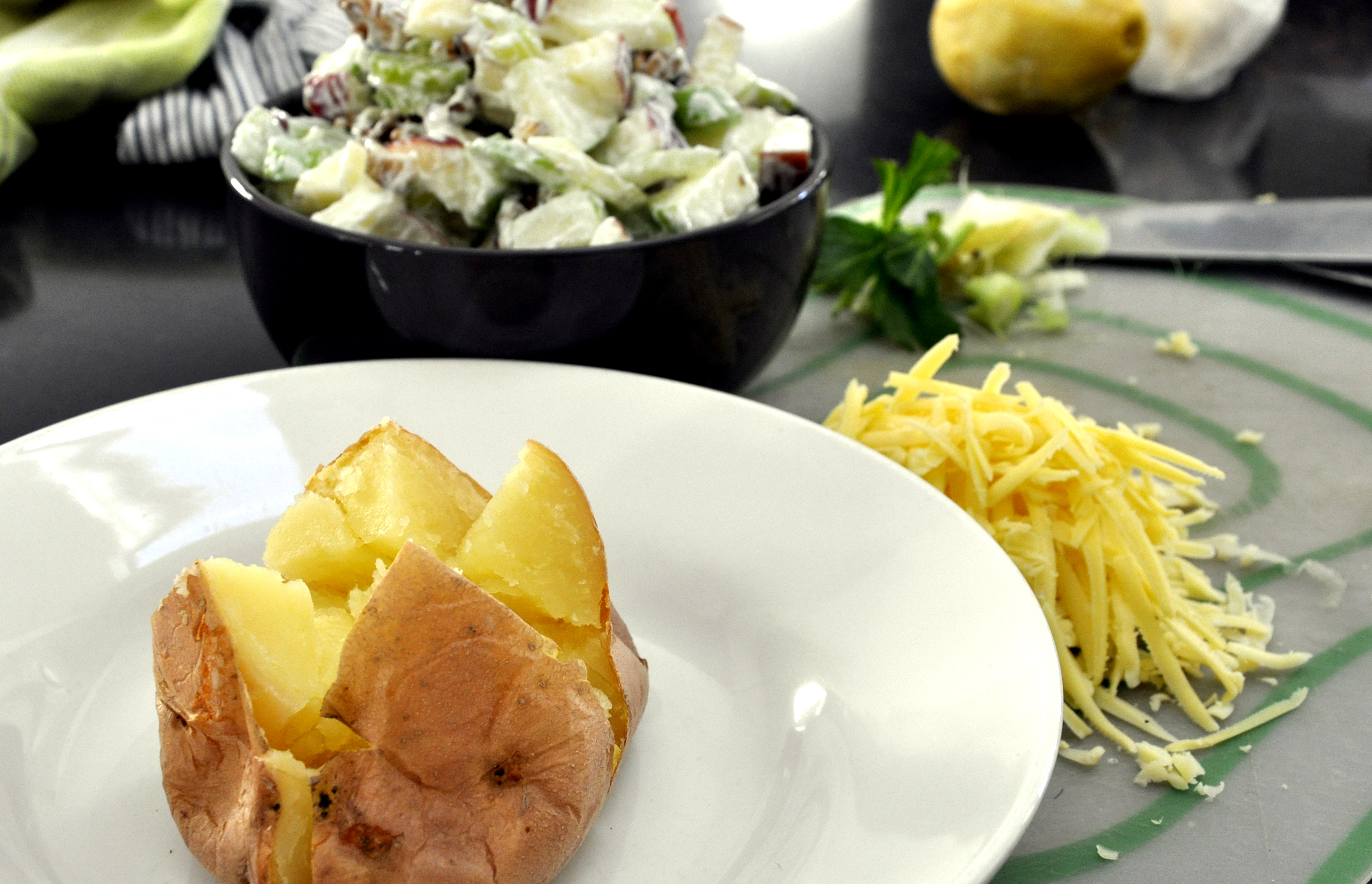 A crispy baked jacket potato is my greatest temptation to over indulge in butter, or sour cream so instead of serving a jacket potatoes as a side dish, I make a meal of it with a light and luscious crisp salad dressed with low fat yoghurt. Sometimes I add the cheese to the salad for that melting indulgence, other times I drop shredded cheese into the potato before I add the salad, either way is good. This is a quick meal in preparation, so the time spent waiting for the potatoes to bake can be spent with your feet up!