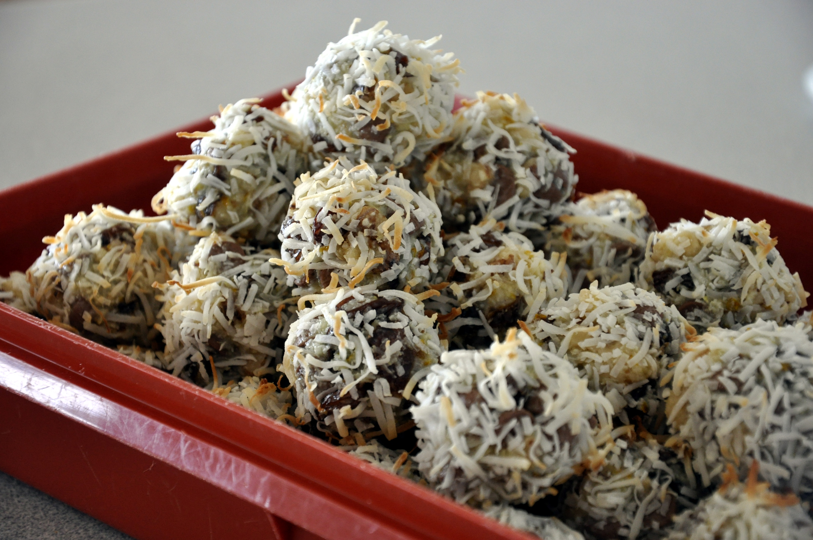 Using wet hands, roll the mix into bite sized balls, toss in shredded coconut.