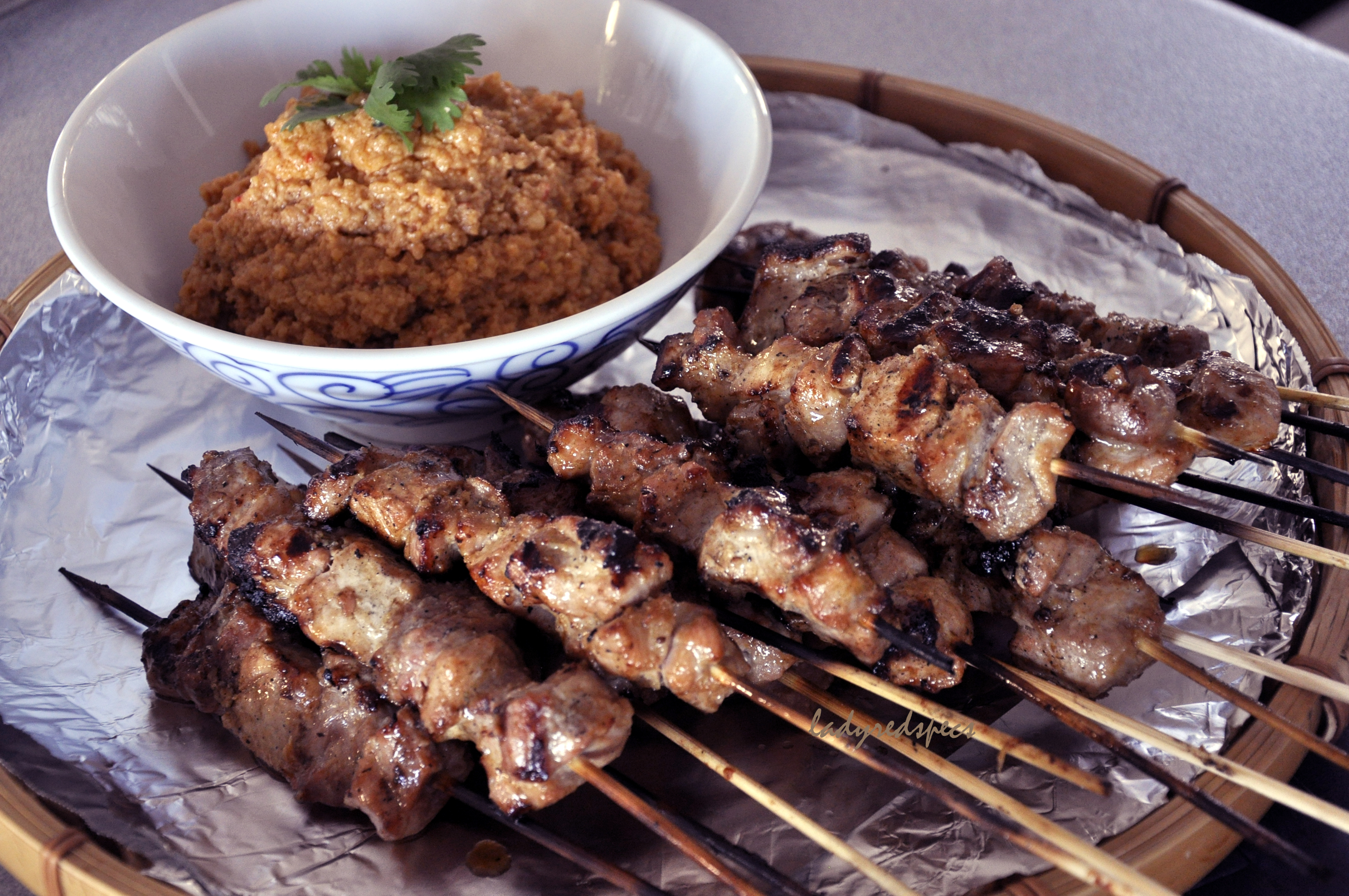 satay sauce servedHot, spicy and fragrant, sweet, salty and crunchy, all these words describe my peanut satay sauce. BBQ season calls for plenty of meat saucing options. Mustard and ketchup are OK for pedestrian palates while I prefer homemade tomato relish, kasaundi and mango chutney on basic barbecued meats. Diced pork, chicken and beef, threaded on bamboo skewers can be marinated in a light seasoning of ginger, garlic, chilli, soy and peanut oil. After grilling on the barbie, satay skewers are delicious served with peanut satay sauce.