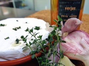 Finely slice the garlic clove, then poke a sliver of garlic and a small sprig of thyme into each slit. Spoon the verjuice over the cheese, then scatter the surface with thyme and black pepper.