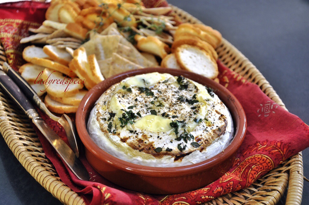 My Spanish terracotta tapas dish was the perfect choice for both baking and serving the cheese. The aroma of the cheese fresh from the oven was enticing. I took my warm cheese to the party on a basket with commercial gluten free crackers. If a successful dish can be measured by leftovers then my warm baked cheese was a winner.