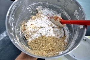 Using a metal spoon stir in the almond meal one cupful at a time.