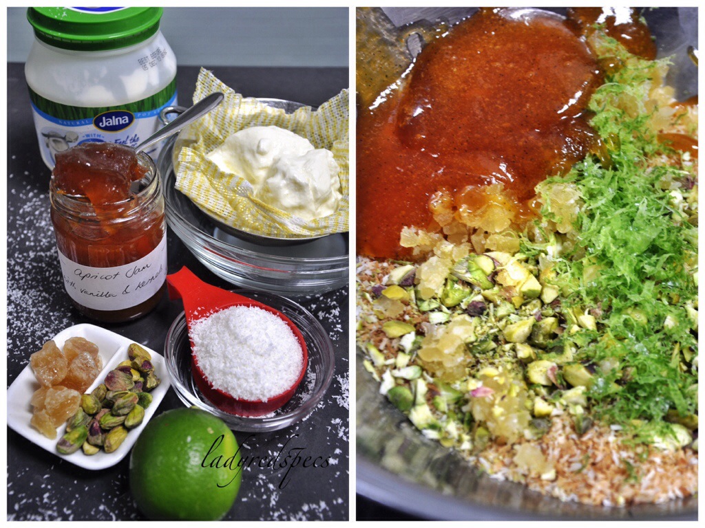 Finely hand chop the pistachios and ginger and add to the coconut. Either strain or chop the jam to integrate any large pieces of fruit, then add to the dry ingredients. Add the lime zest, then the yoghurt.