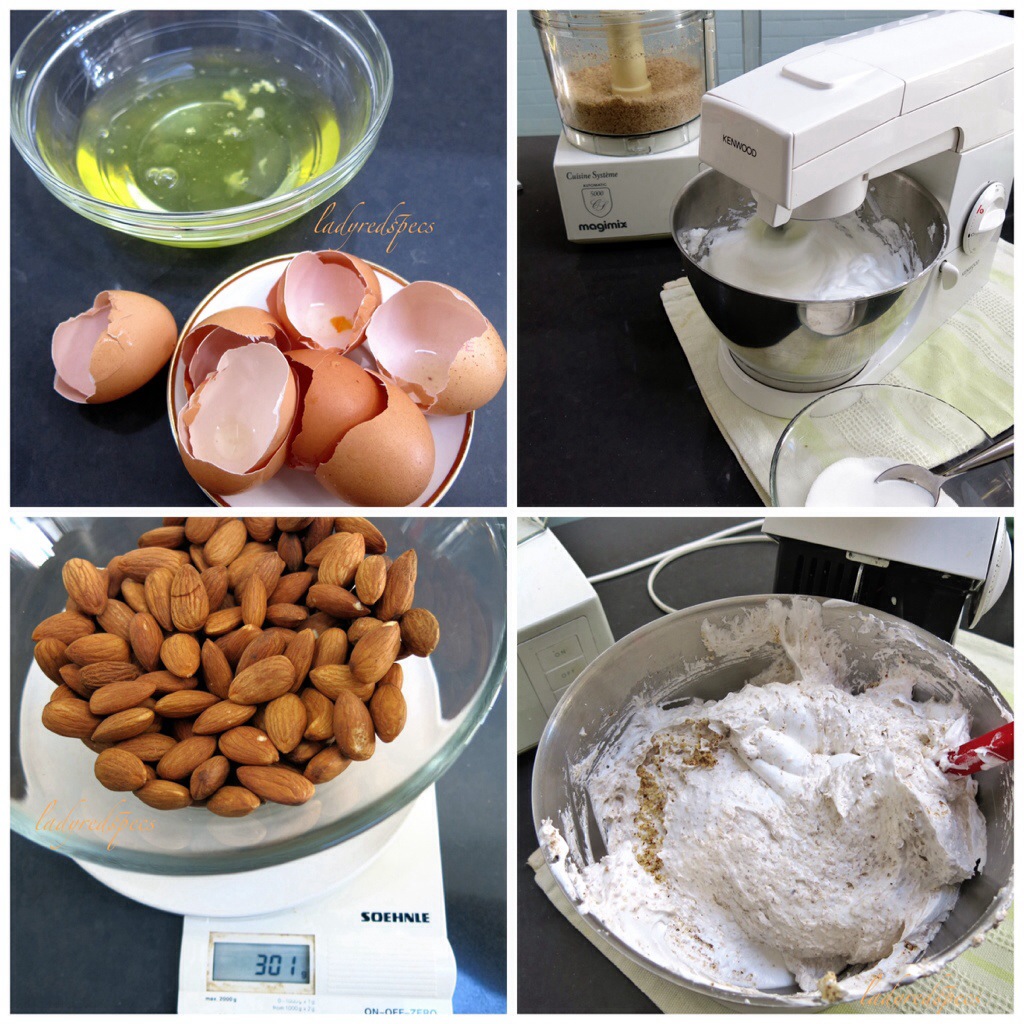 Whisk egg whites until stiff, then slowly beat in the sugar one tablespoon at a time. Fold in the almonds.
