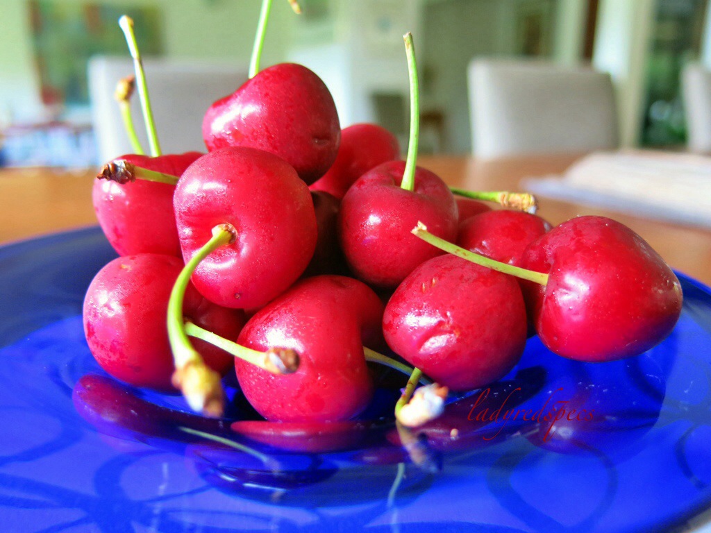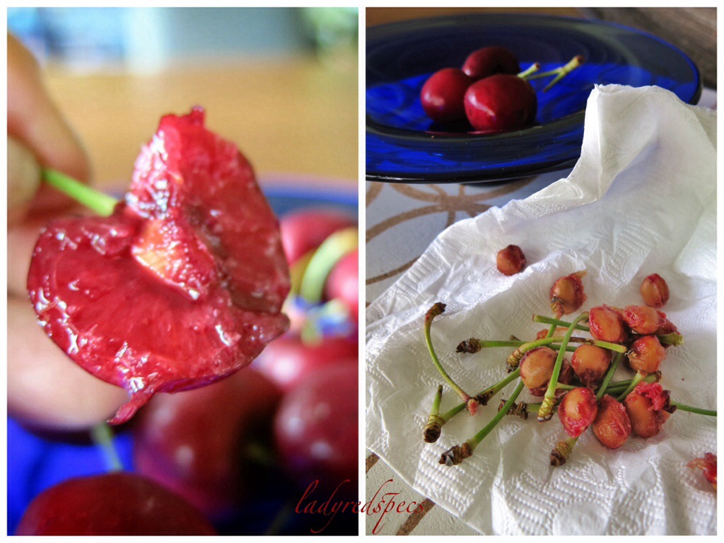 I picked up my fruit by the stem and put it into my mouth whole. With the fruit firmly held behind my front teeth I pulled off the stem with a “pop.” There was a pleasant element of resistance as I bit into the flesh, then my mouth filled with fresh sweet juice. I stripped the pip of flesh rolling it with my tongue as I went, before greedily taking another cherry.