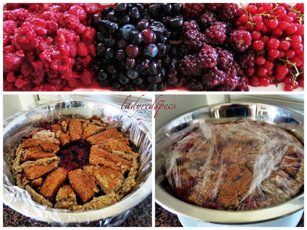 An authentic version of this pudding uses thinly sliced white bread to enclose the luscious mass of sweet and tart berries but the crumbly texture and pappy structure of gluten free bread rules it out as an option for me.