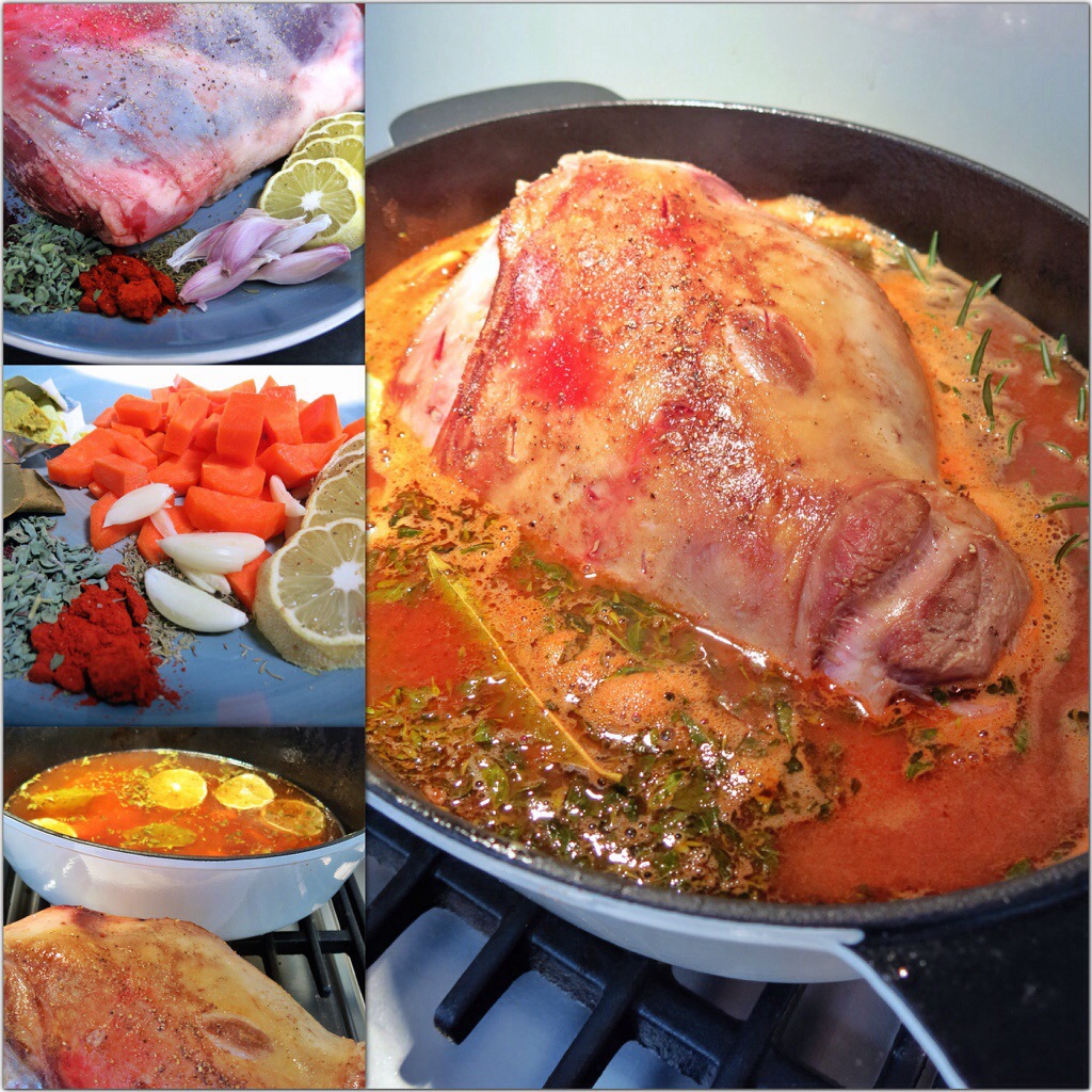 Add enough hot stock to almost cover the joint. Return the stock to the boil then transfer to the oven and slow roast for 3 hours. By this time The meat should be falling off the bone.