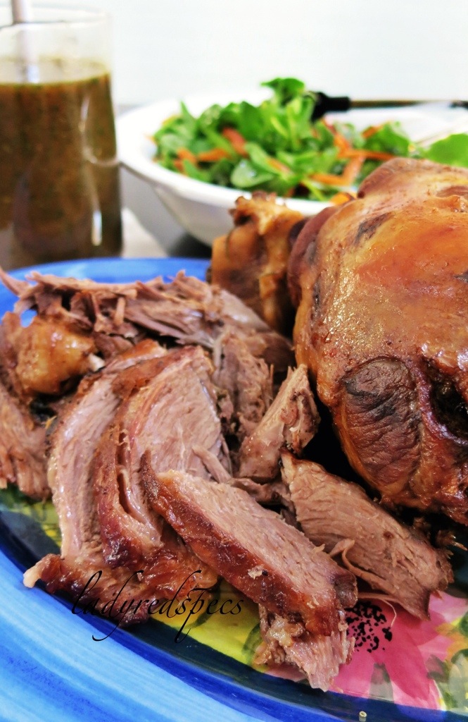 I made a simple lemon and herb pilau, and served the unctious meat on top with the mint infused roasting juices reduced to a sauce. A simple crisp green salad was all that was needed to balance the rich moist meat.