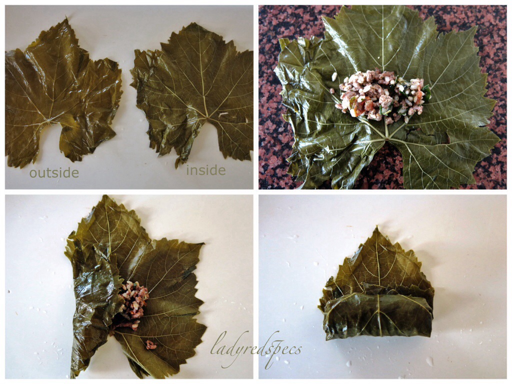Lay the leaves shiny side down, place a dessertspoon of filling at the stem end, fold in the sides then tightly roll the leaf into a cigar shape.