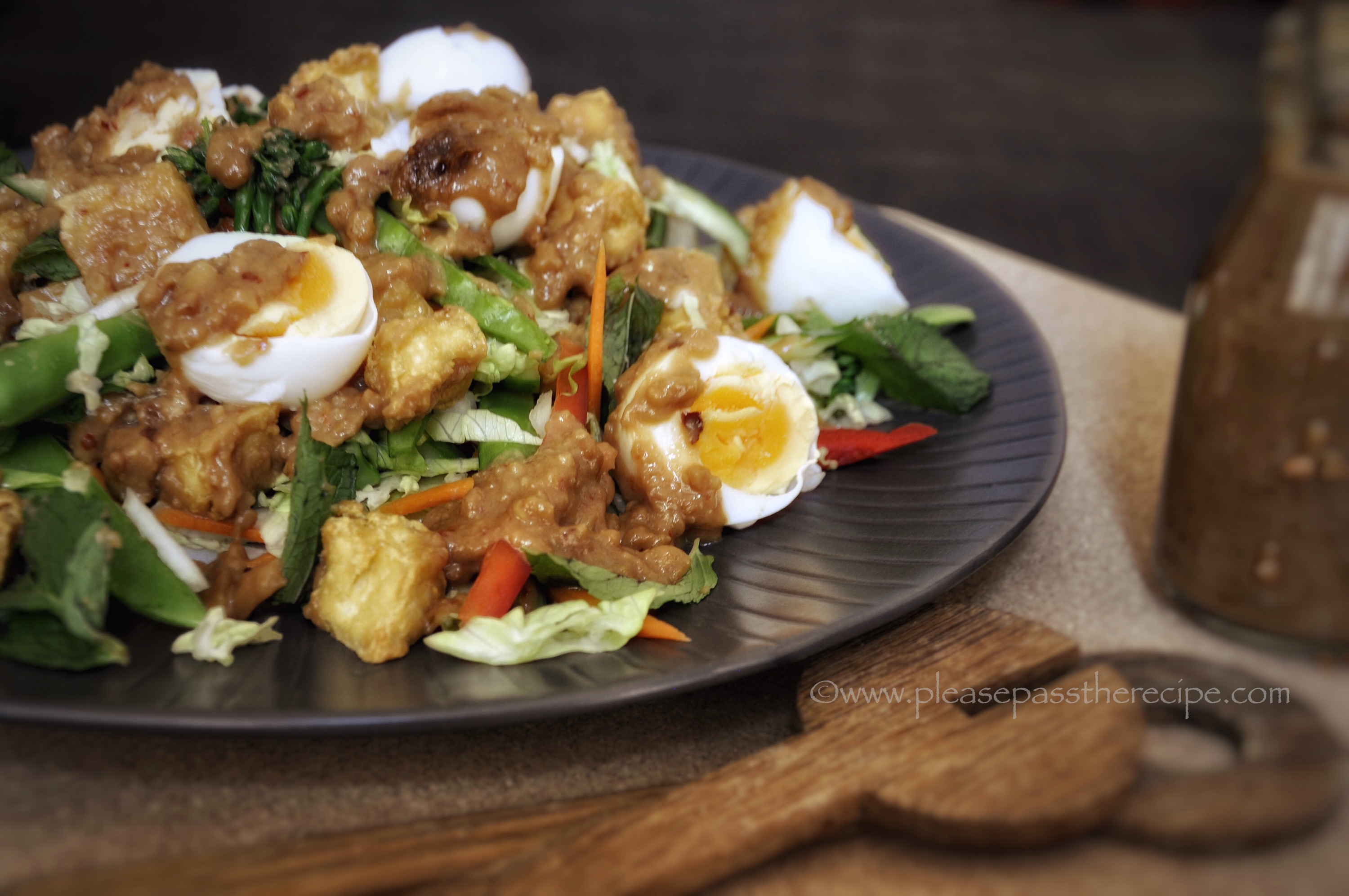 Inspired by but not limited to Simon Bryant’s recipe for Carrot and Fried Tofu Salad with Chilli Peanut Sauce from his fabulous book “Vegies,” this dish resemble Indonesian Gado Gado in so much that it features raw and steamed vegetables, tofu and boiled eggs dressed with a deep and richly flavoured peanut sauce with a punchy amount of chilli.