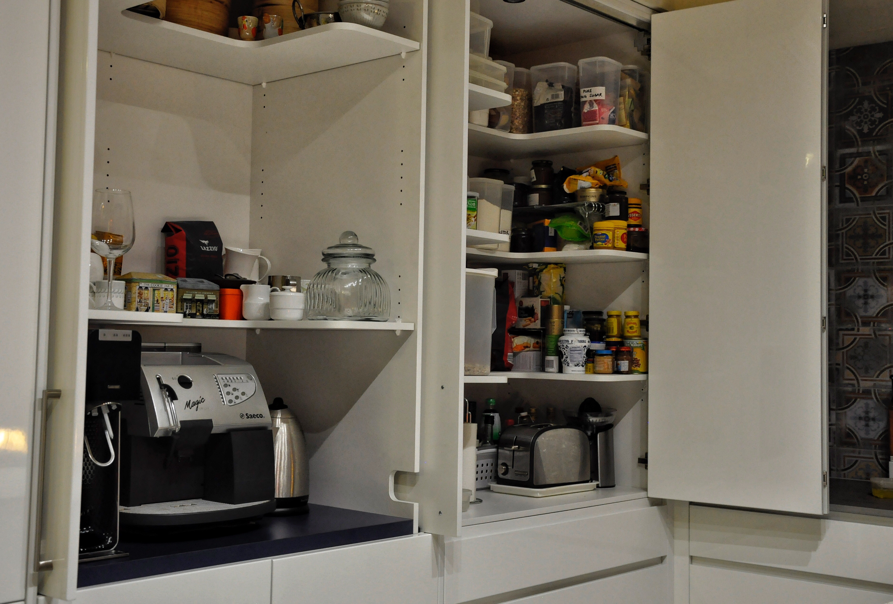 Our smart kitchen designer suggested pocket doors for the appliance cupboard and a bifold door on the pantry so I could work in a space that had minimum impediment into the walkway. Brilliant.