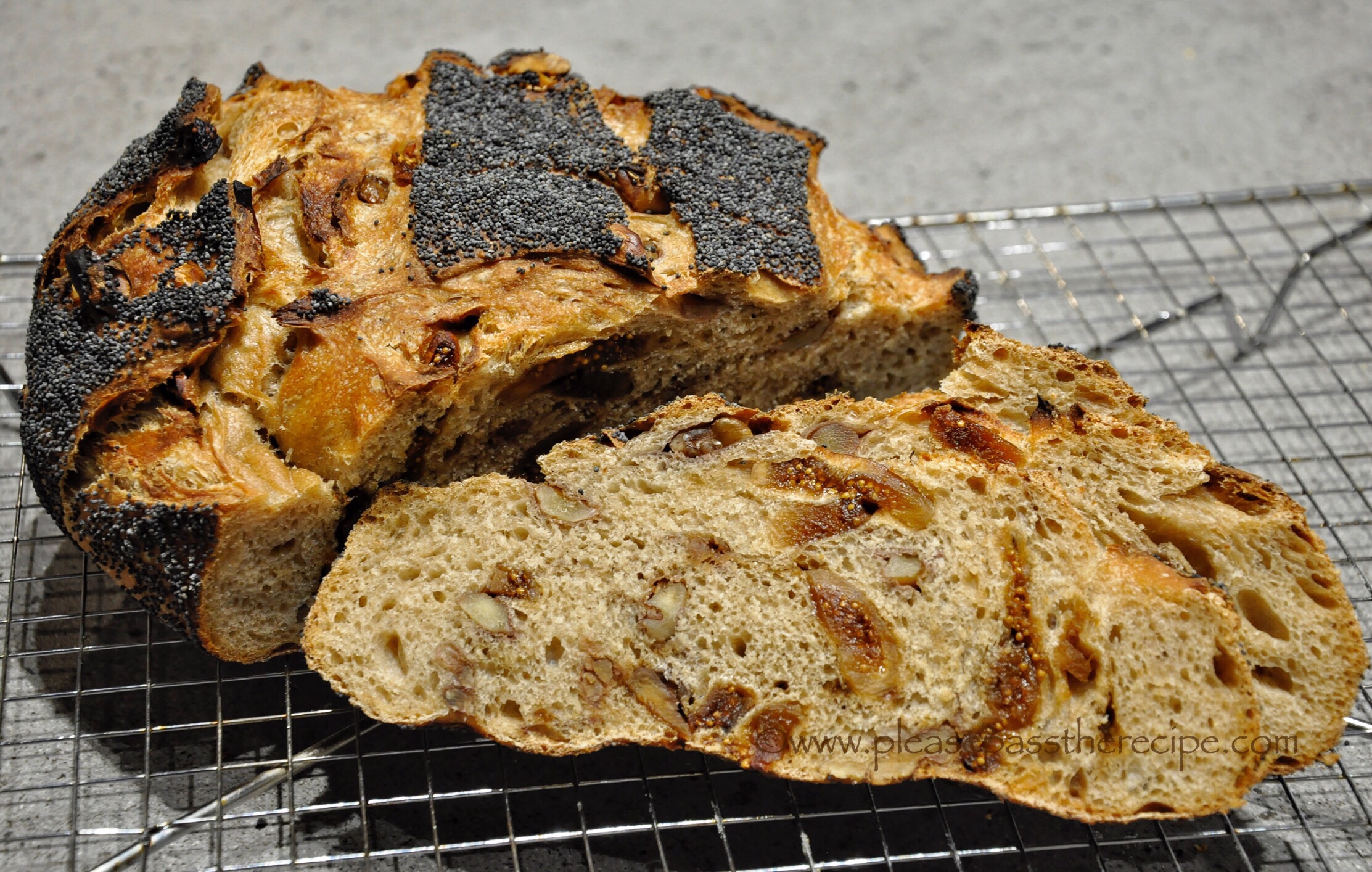 For my part I wanted a loaf akin to sweet raisin bread that would make a delicious treat toasted and served warm slathered in melting butter, so at the final stretch and fold process I scattered, sliced dried figs and broken walnuts over the dough while it was stretched, then sprinkled over ground cinnamon and a little brown sugar. I folded the dough onto inself, in thirds one way, in thirds the other, then shaped the loaf in a boule with a taut surface which I coated in poppy seeds.